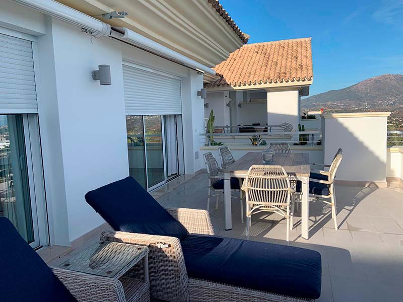 A renovated terrace that embodies the Costa del Sol lifestyle: golf views, sunshine, sea breeze, and Mediterranean elegance in every detail.